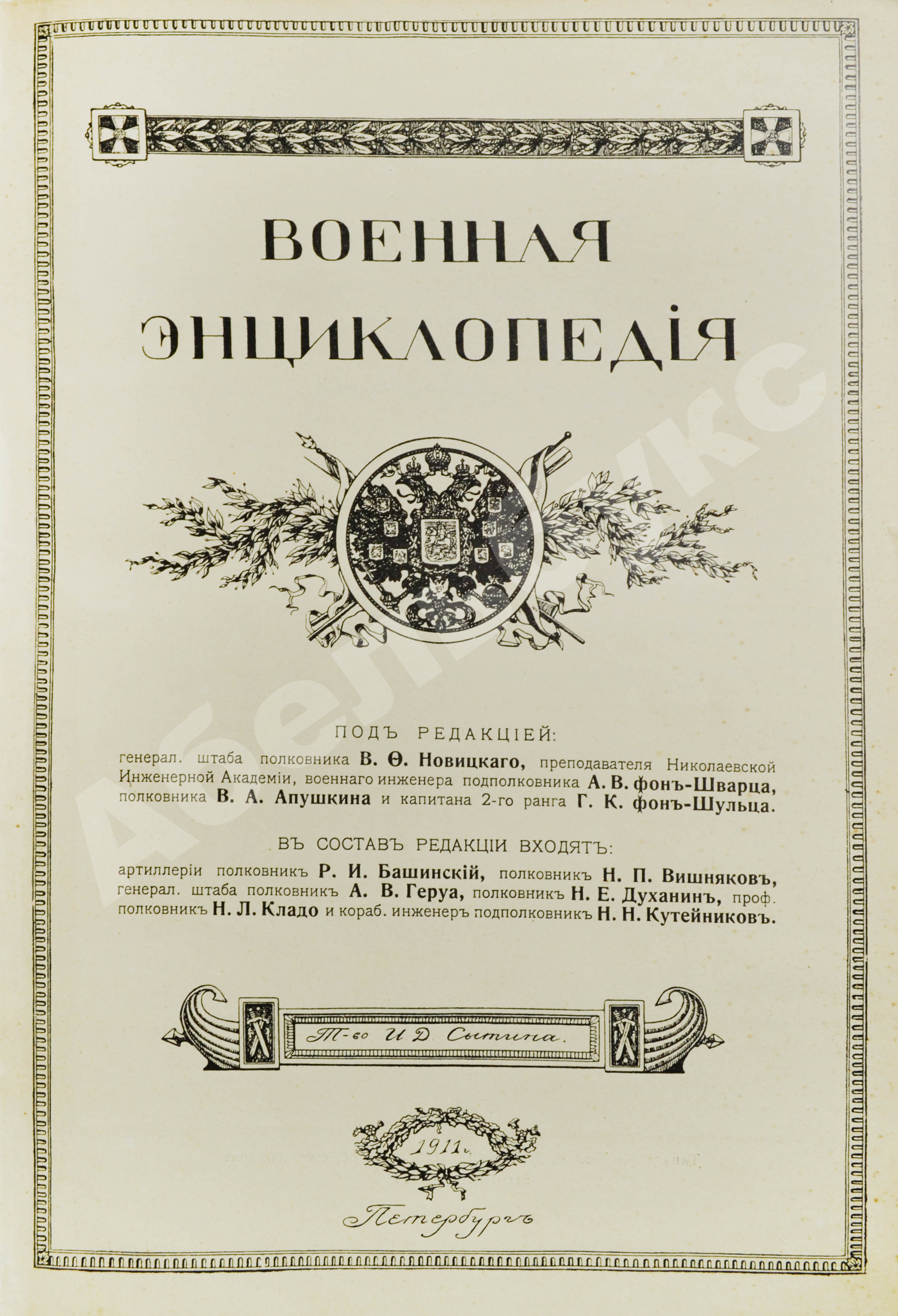 «Военная энциклопедия» — уникальное по своему значению, полноте, качеству и авторитету издание по военному делу и военной истории. Энциклопедия была подготовлена коллективом выдающихся военных деятелей: военачальника и историка Василия Федоровича Новицкого (1869-1929), военного инженера, героя обороны крепостей Порт-Артур и Ивангорода Александра Владимировича фон Шварца (1874-1953) офицеров Генерального штаба, военных инженеров, артиллеристов, кавалеристов, военных медиков и юристы, корабельных инженеров, моряков, топографов, художников. Редакция энциклопедии состояла из четырех отделов: специальных военных знаний, военно-технических знаний и специальных родов войск, общих военных знаний, военно-морских знаний.
