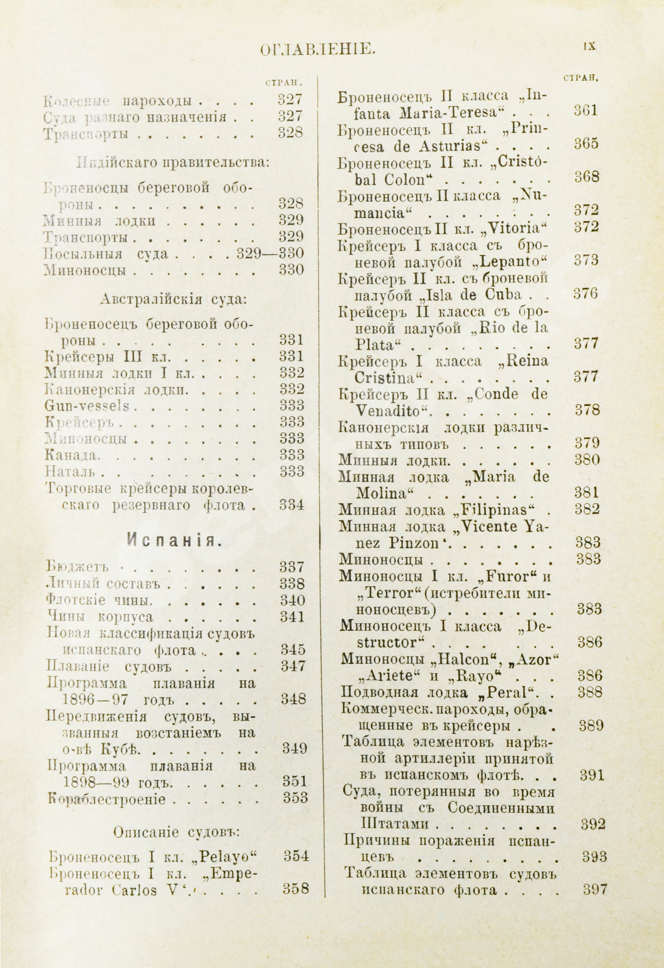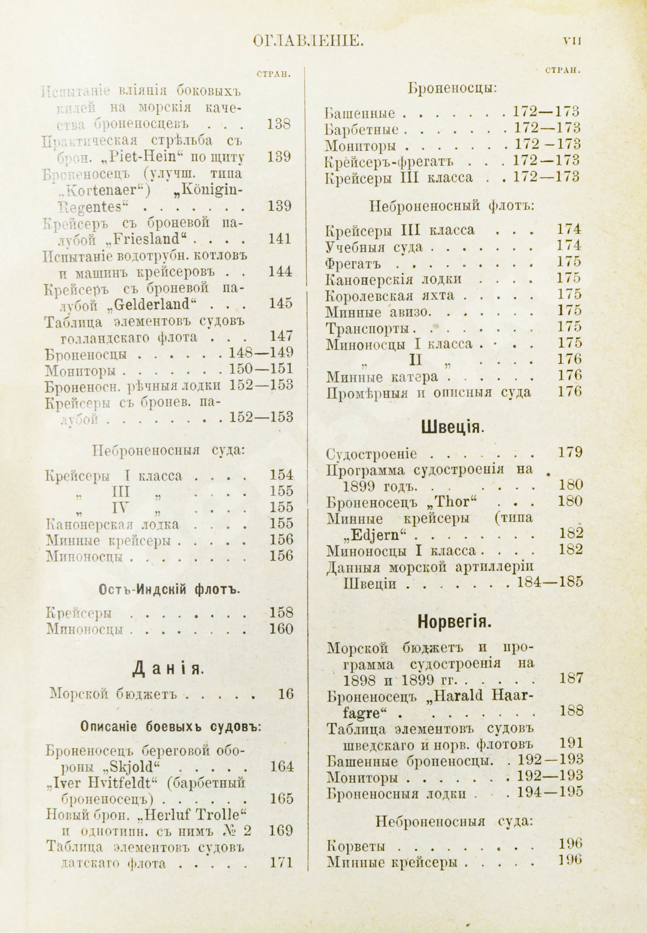 Материалы, посвящённые флотам разных стран, различны по объёму и составу представленной информации. Минимальный набор сведений включает морской бюджет страны, описания избранных судов и сводную таблицу всех имевшихся у страны судов с указанием их вооружённости и оснащённости. В книжке за 1899 год информация о Германии включает исторический обзор немецкого флота. Испания рассмотрена в контексте проигранной ею испано-американской войны 1898 года.
