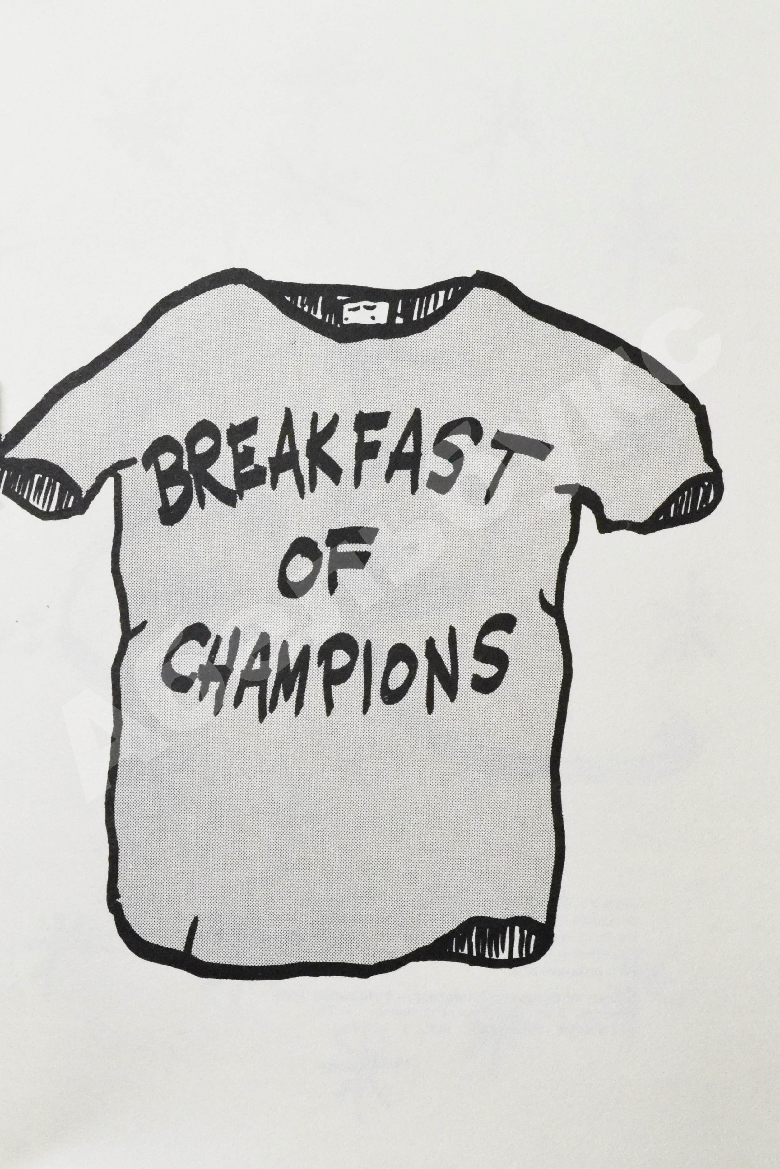 «Завтрак для чемпионов» Воннегут подарил себе на 50-летие. Как он объяснил, захотел «очистить свои мозги от всей той трухи, которая в них накопилась, – всякие флаги, зады, панталоны». Он выбрасывал из головы разные образы и установки, которые обычно вкладывают людям, поэтому книга получилась похожа на азбуку для инопланетян, ничего не знающих о нашей жизни. Для наглядности некоторые понятия Воннегут даже проиллюстрировал: вот флаг, корова, револьвер…
