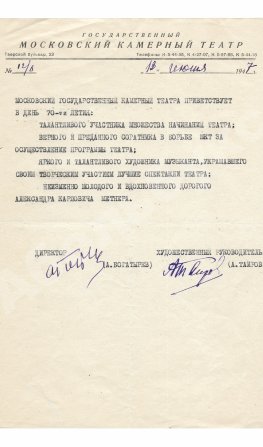 Таиров, А.Я. [автограф] Машинописное поздравительное письмо в честь композитора Александра Метнера